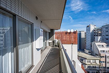 約8mのワイドスパンバルコニー。水栓があるので、植栽の水やりや汚れた物を洗うのに便利です
