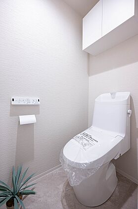 吊り戸棚を設けたトイレです。温水洗浄便座付きなので、快適にご使用いただけます