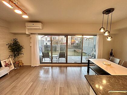 約16.5帖の広々としたLDK。南西向きで陽当たりも良く、床暖房も完備。専用庭へと繋がる大きな窓からは開放感が広がり、家族の笑顔があふれる団らんの場となります。
