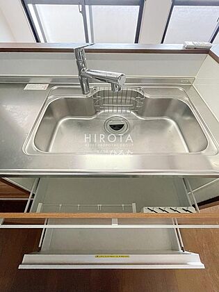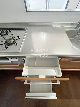 3口ガスコンロ付きシステムキッチンです。細かい収納スペースも嬉しいですね。