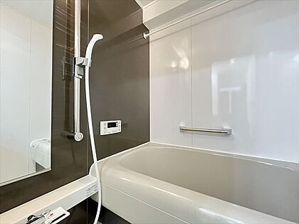 壁の色に変化をつけているので、明るさを保ちつつも落ち着いた印象の浴室です。広々としたバスタブは1日の疲れをリフレッシュ出来そうですね。