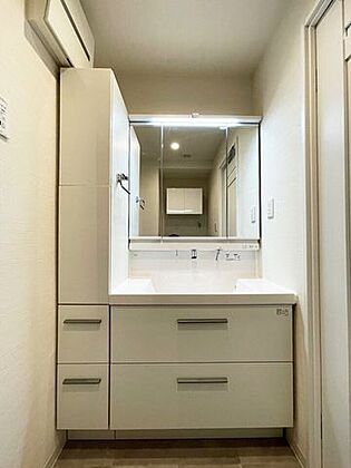 洗面台には三面鏡を採用。身だしなみを整えやすい事はもちろんですが、鏡の後ろに収納スペースを設ける事により、散らかりやすい洗面スペースをすっきりさせる事が出来ます!