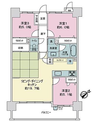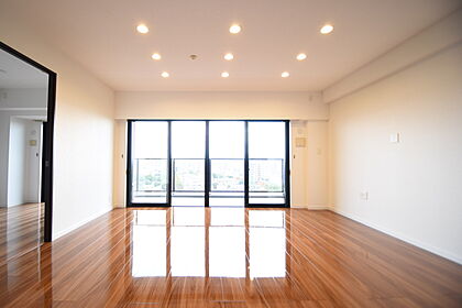 畳コーナーも含めて約19.7帖のLDK、南西向きバルコニーに面した明るいお部屋です