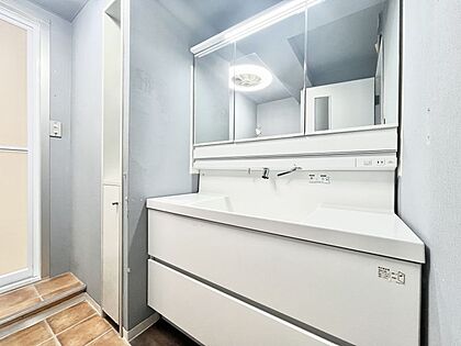 三面鏡付きの洗面台!収納棚もあるのでバスタオルなどの置き場確保にも使えます!