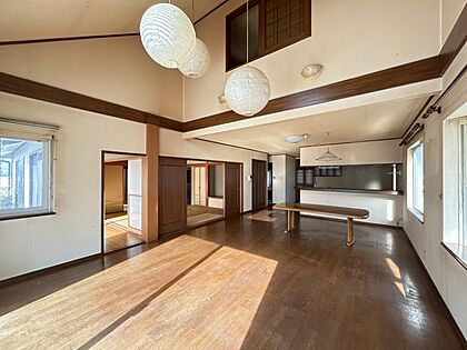 【現況販売】約30帖のリビングは吹き抜けになっていて非常に解放感があります。テーブルは処分いたします。