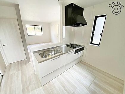 14.75帖のLDK キッチンと一体化したリビングなら家族みんなが自然と料理に参加したり、片づけたりしながらコミュニケーションがとれます