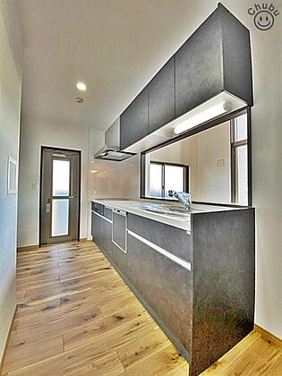 スライド収納タイプのシステムキッチンで収納量が豊富です。家族と一緒にお料理することができるゆったりしたキッチンスペース!