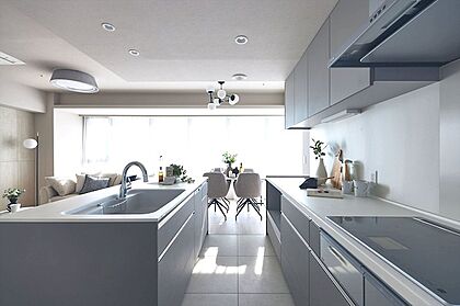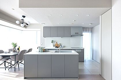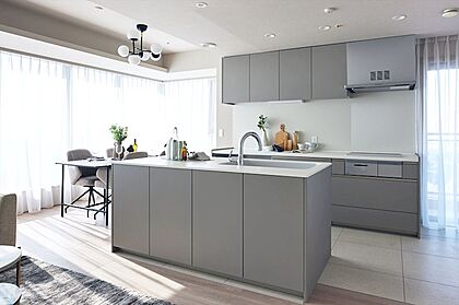 【キッチン】II型キッチンを囲むレイアウトで、スムーズな家事動線を確保していただけます。シンクとカウンターは汚れがたまりにくく、お手入れのしやすいシームレス結合を採用しております。
