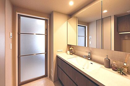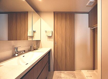 【洗面台】広々とした洗面室は、ゆとりのある作業スペースを確保しております。日々の身支度から家事まで、快適かつ効率的にこなせます。