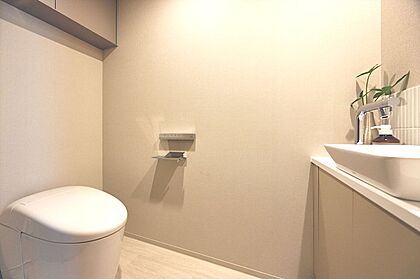 【トイレ】奥行きのあるゆったりとしたトイレには、手洗いカウンターを設けており、来客時にも気兼ねなくお使いいただける設計になっております。ペーパーホルダーには小物等を置いてける小スペースを設けております
