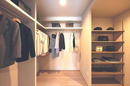 【WIC】玄関からの流れが途切れることなく、約3.2帖の大型WTCから主寝室とスムーズにプライベート空間へ移行できるため、日々の生活動線を非常に快適にお過ごしいただけます。
