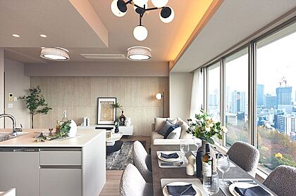 【LDK】約21.2帖のLDKでは2面採光で一日中明るく、ゆったり空間と大きな窓で、 実際以上の広がりを実感していただけます。