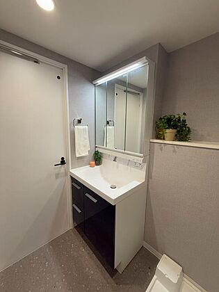 【洗面室】身支度に便利な3面鏡付きの洗面化粧台。鏡の裏とボウルの下には収納が設けられているので、化粧品やドライヤーなどが収納できます。