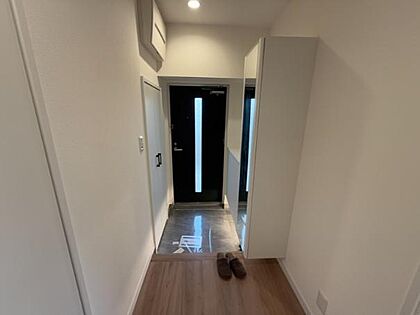 【玄関】お出かけ前の身だしなみチェックに便利な、姿見鏡付きのシューズボックスが設置されています。豊富な収納が備わり、玄関周りの清潔感を保つことができます。