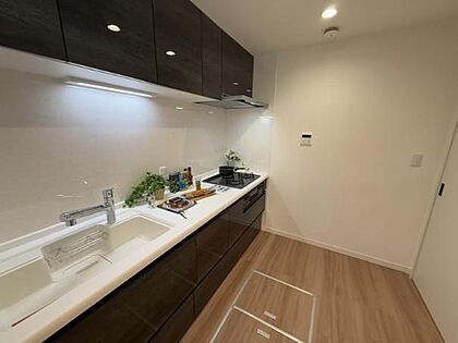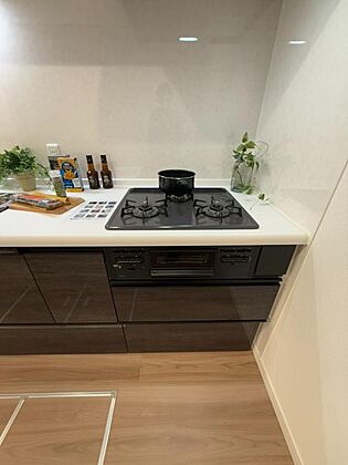 【キッチン】グリル付きの3口コンロが搭載されています。同時調理ができ、朝の忙しい時間や来客時に重宝します。料理のレパートリーも広がりそうです。