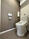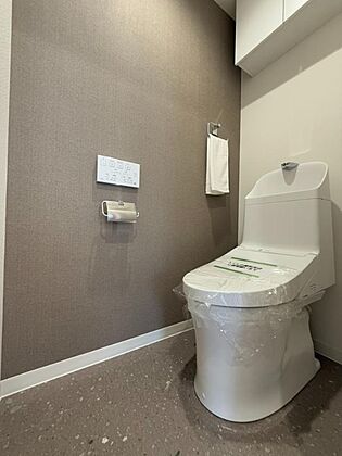 【トイレ】毎日清潔にご使用いただける、温水洗浄便座が備わっています。壁にリモコンが付いているので、操作がしやすいです。吊戸棚にはトイレットペーパーなどを収納可能。