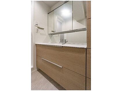シンプルでアレンジしやすいデザインの洗面台。清潔感ある明るい空間です。