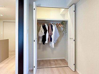 【家具・小物(調度品)は販売価格に含まれません】クローゼットには棚やハンガーパイプが付いており、スーツや上着などがスッキリ収納可能です。