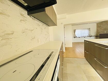 3口のIHタイプのオールメタルホワイトのスタイリッシュなキッチンスペース。