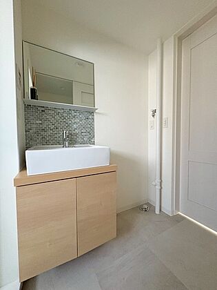 LIXIL社の洗面化粧台には名古屋モザイクのタイルを施工。ハイセンスな空間に。