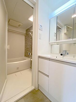 浴室乾燥暖房機と追炊き付き。 石目調のアクセントパネルがおしゃれです