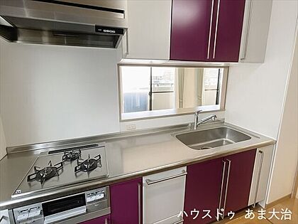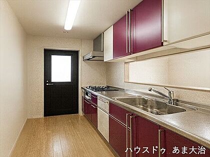 ボルドー色のキッチンは、高級感や落ち着いた雰囲気を演出できそうです◎また汚れが目立ちにくいことも嬉しいポイント。 ※居住中につき室内をCGにて家具消しをしたものです。