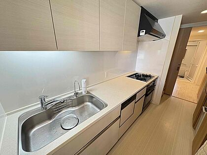 広々とした調理スペースに三口コンロ、食洗機を備えたキッチン。シンクも扱いやすいサイズで、調理から後片付けまでスムーズ。毎日の家事を快適にしてくれる設備が整っています。