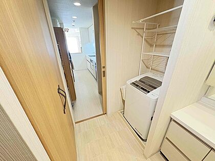 洗面室にも収納があり、洗面室からキッチンへつながる動線がスムーズなので、洗濯物を干す際や家事の移動がしやすく、日常の作業効率がアップする間取りです。