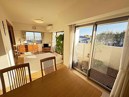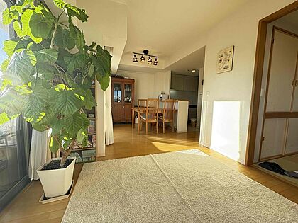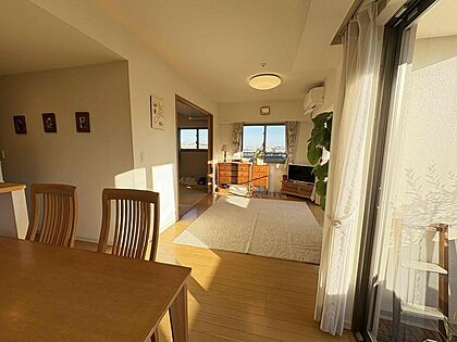 南向きの大きな窓から明るい光が差し込むリビング。バルコニーへの動線も良く、開放感のある空間です。ダイニングともつながり、家族がゆったり過ごせる心地よい住まいです。
