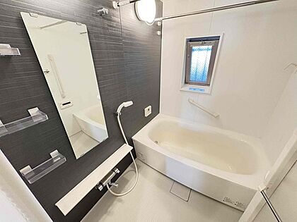 浴室は落ち着いたアクセント壁と清潔感ある白を組み合わせた空間。窓付きで換気しやすく、日々の入浴を心地よく楽しめます。手すりもあり、安心して使える設計です。
