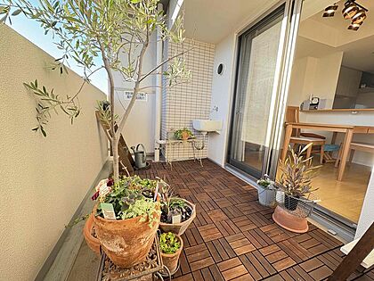 バルコニーにはスロップシンクがあり、植物の水やりや掃除に便利。ウッド調の床材で過ごしやすく、ガーデニングを楽しむスペースとしても活用できます。明るさも魅力です。