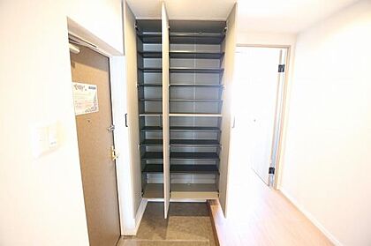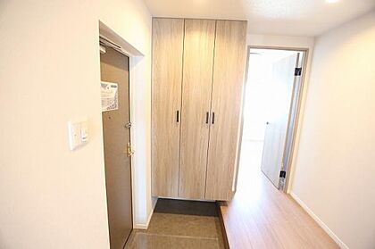 玄関には人感センサー付きの照明が設置されており、帰宅時に玄関ドアを開けますと自動で明るく点灯いたします。また、玄関には大きなシューズボックスも備わっております。