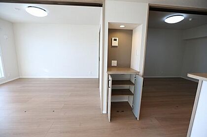 リビングに設置されております、テレビモニター付きインターフォンと電話台でございます。