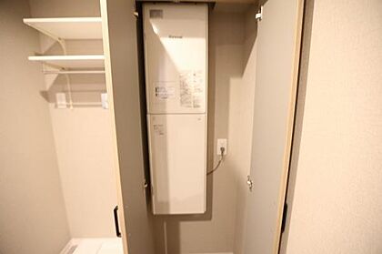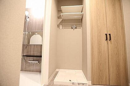 洗濯機置き場でございます。防水パンと洗濯機用水栓が設置されており、上部には便利な棚も備わっております。