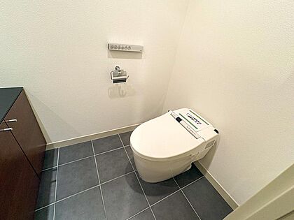 清潔感あふれるトイレは、温水洗浄便座を完備しており、家族みんなが快適に使えるプライベート空間です。落ち着いた色合いの床が空間を引き締めます。