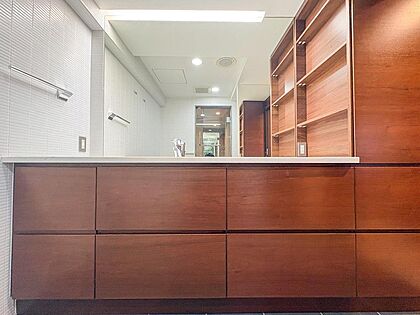 木のぬくもりを感じる洗面台と、たっぷり収納できる棚が魅力。忙しい朝も家族みんなでゆったり準備できる、機能的な洗面空間です。