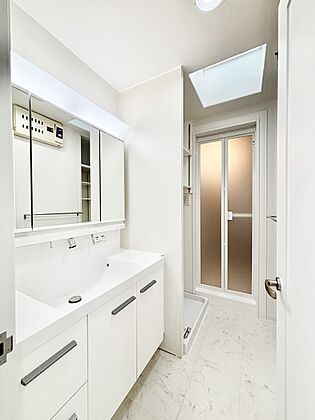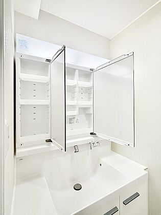 三面鏡の裏に、化粧品や衛生用品などを収納可能。洗面台をすっきりと保ちます!
