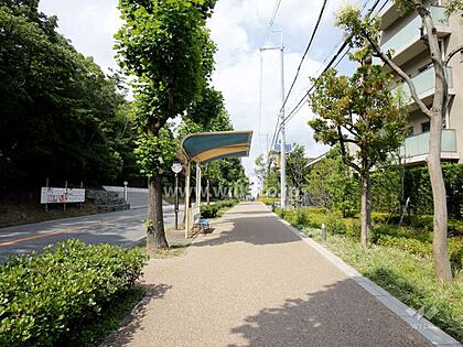 敷地南側の通路。北大阪急行線「千里中央」駅徒歩13分。2012年8月築。総戸数256戸の分譲マンションです。
