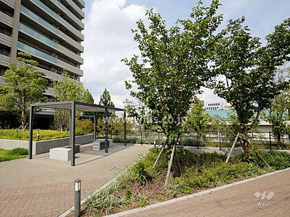 敷地南東側のオープンスペース。北大阪急行線「千里中央」駅徒歩13分。2012年8月築。総戸数256戸の分譲マンションです。