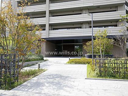 エントランスアプローチ。北大阪急行線「千里中央」駅徒歩13分。2012年8月築。総戸数256戸の分譲マンションです。