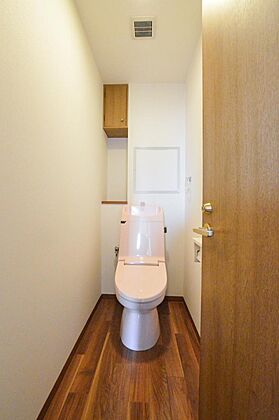 【トイレ】広々としたトイレ空間ちょっとした棚もあるのでトイレットペーパーの替えもおけそうです!