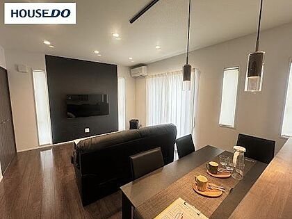 明るくモダンな空間。ダイニングエリアにはペンダントライトが設置されています。