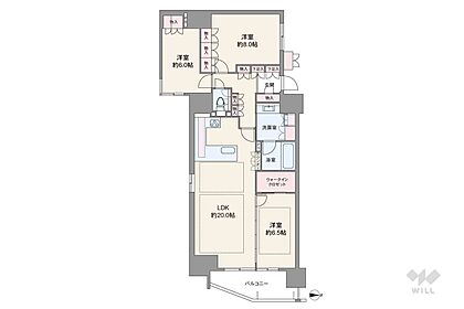 間取りは専有面積94.3平米の3LDK。LDK約20.0帖の縦長リビングのプラン。バルコニー面積は7.7平米です。