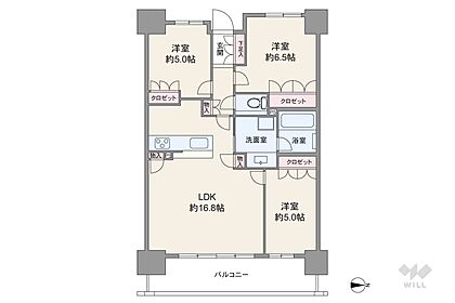 間取りは専有面積70.66平米の3LDK。LDK約16.8帖の縦長リビングのプラン。バルコニー面積は10.5平米です。