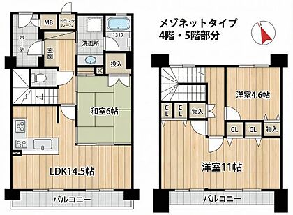 メゾネットタイプでゆったりした間取りが特徴です。リビング・ダイニングが14.5帖と広く家事動線も良好です。各洋室には収納スペースがしっかり確保されています。