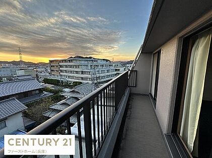 見晴らしの良い高層階バルコニーが魅力です。爽やかな空気を楽しめるスペースです。広々とした空間で日当たりも良好です。住宅地の風景も一望できます。