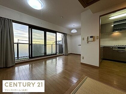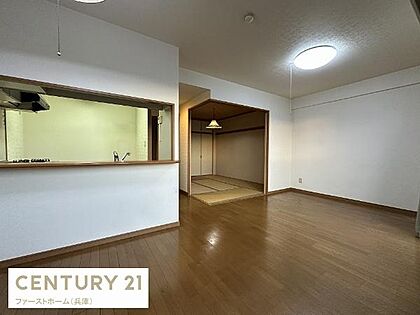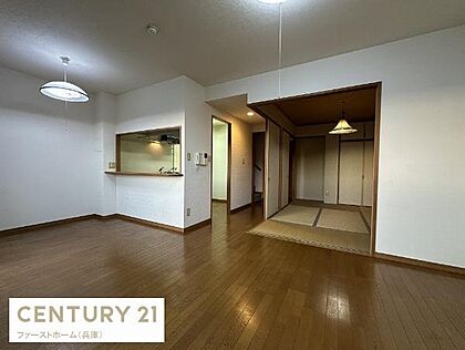 大きな窓からたっぷり光が入るリビングです。フローリングが明るく開放感のある空間となっています。隣接する和室との一体感も魅力です。キッチンからの見通しも良好で使い勝手の良い間取りです。