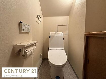 清潔感のあるシンプルなトイレ空間です。ペーパーホルダーやタオル掛けも設置されており使い勝手が考えられています。落ち着いた色合いでまとめられており日常生活に馴染みやすいデザインです。