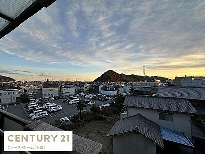 バルコニーからの見晴らしが広がり遠くの山並みや町並みを望むことができます。駐車スペースも多く周辺の建物との距離も保たれています。開放感のある空間が楽しめるバルコニーです。夕方の景色も趣があります。