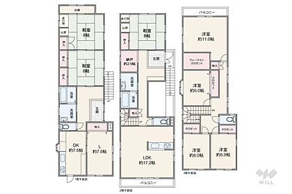 間取りは延床面積237.65平米の5LDK+2LDK。玄関や水回りが2か所ずつあり、1階を2LDK、2・3階を5LDKとして使える分離型の二世帯住宅プラン。全居室6帖以上のゆとりある造りです。